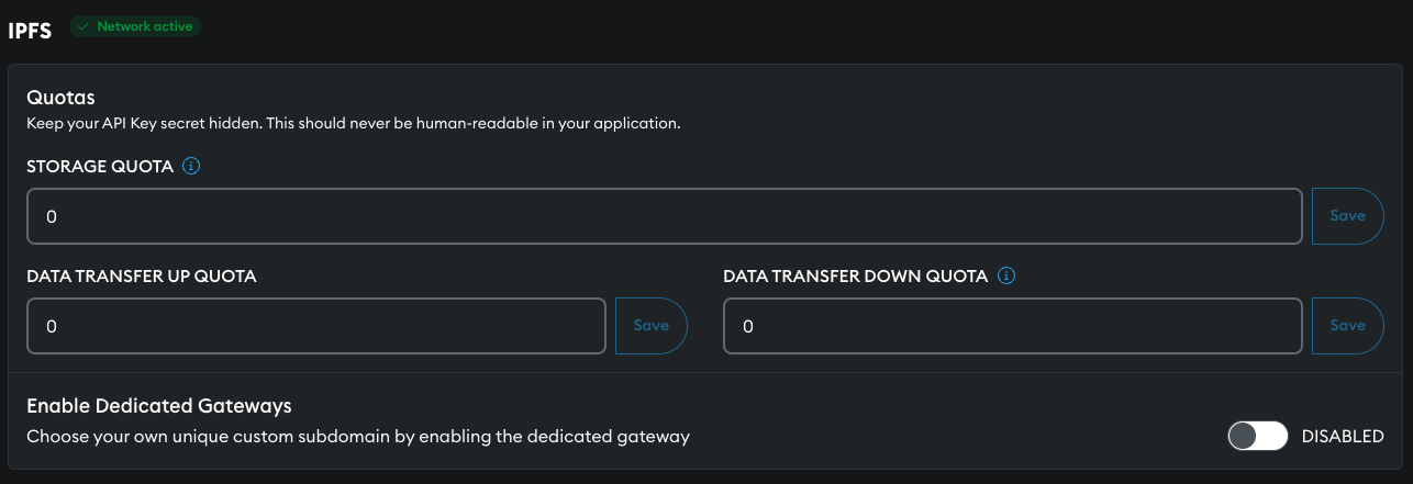 • Data transfer UP quota - Maximum data per month sent to the IPFS service, for example, 0.001 GB.